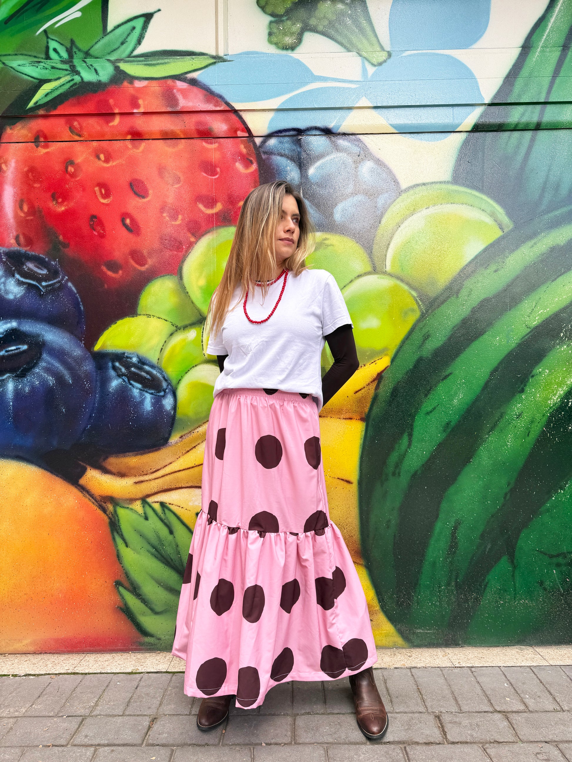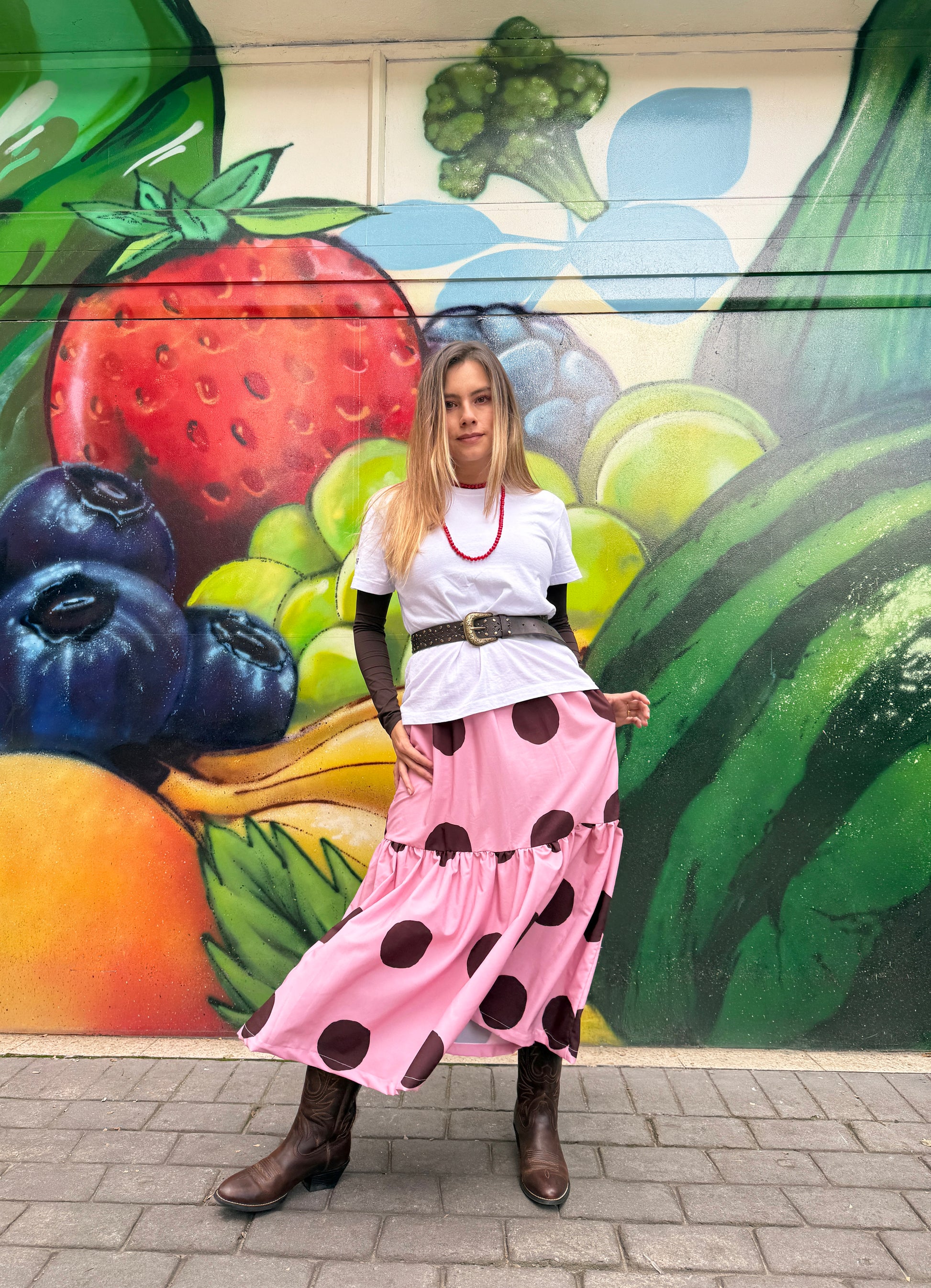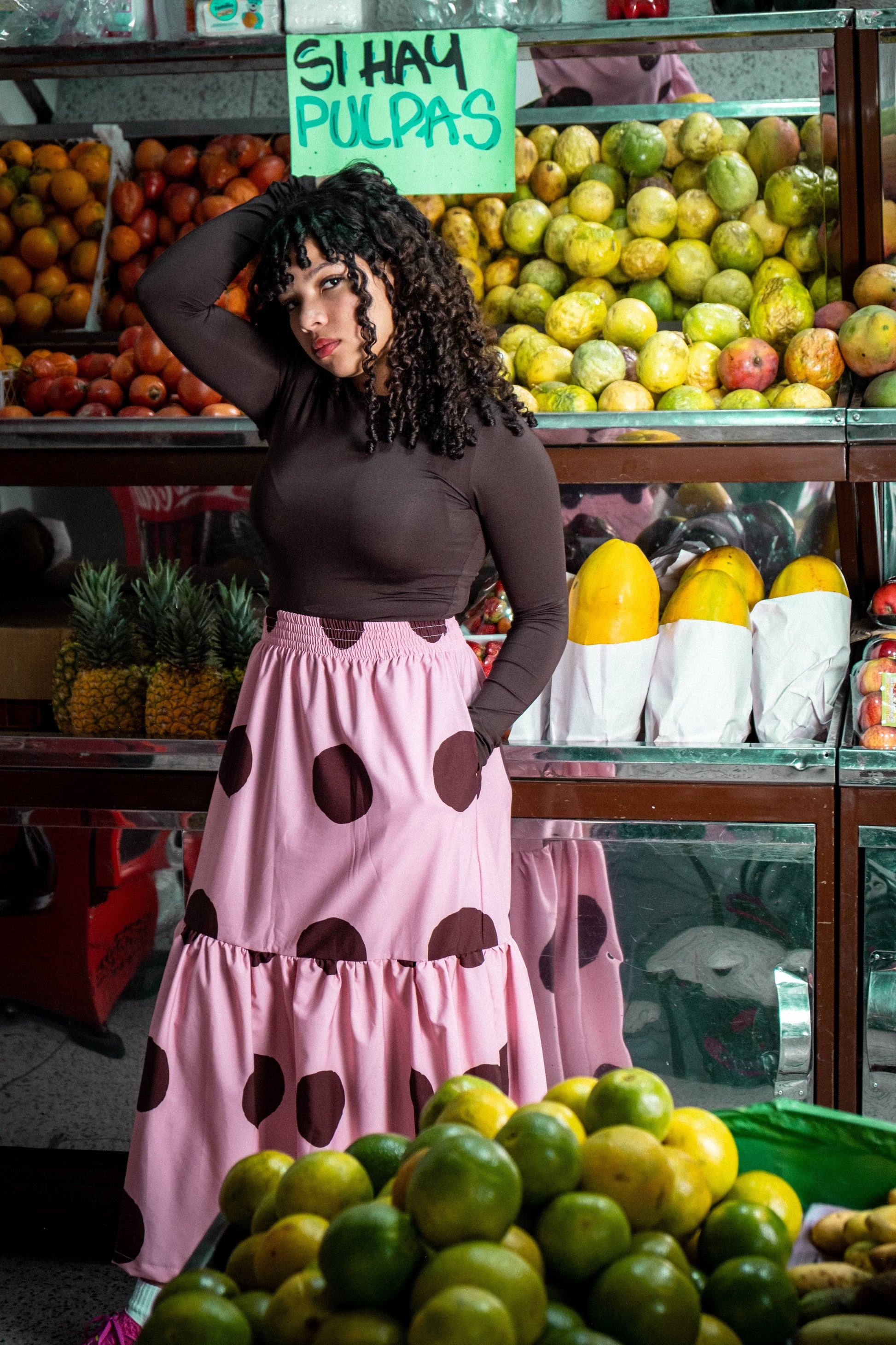 Está diseñada en seda mango, una tela suave, fresca y con mucho movimiento; su estampado es 100% exclusivo de nuestra marca. Su silueta es amplia y cómoda, tiene bolsillos, su cintura viene enresortada.
