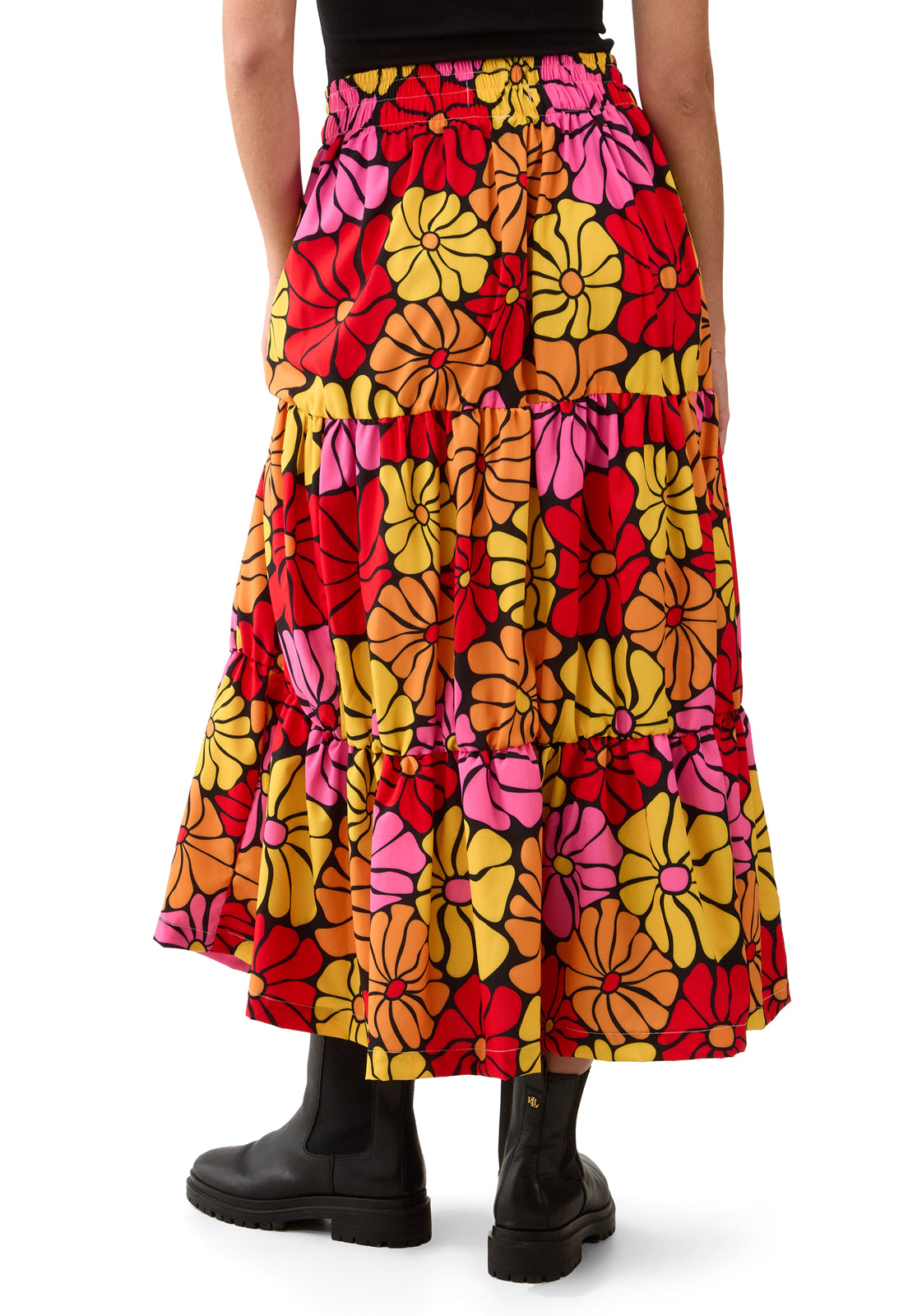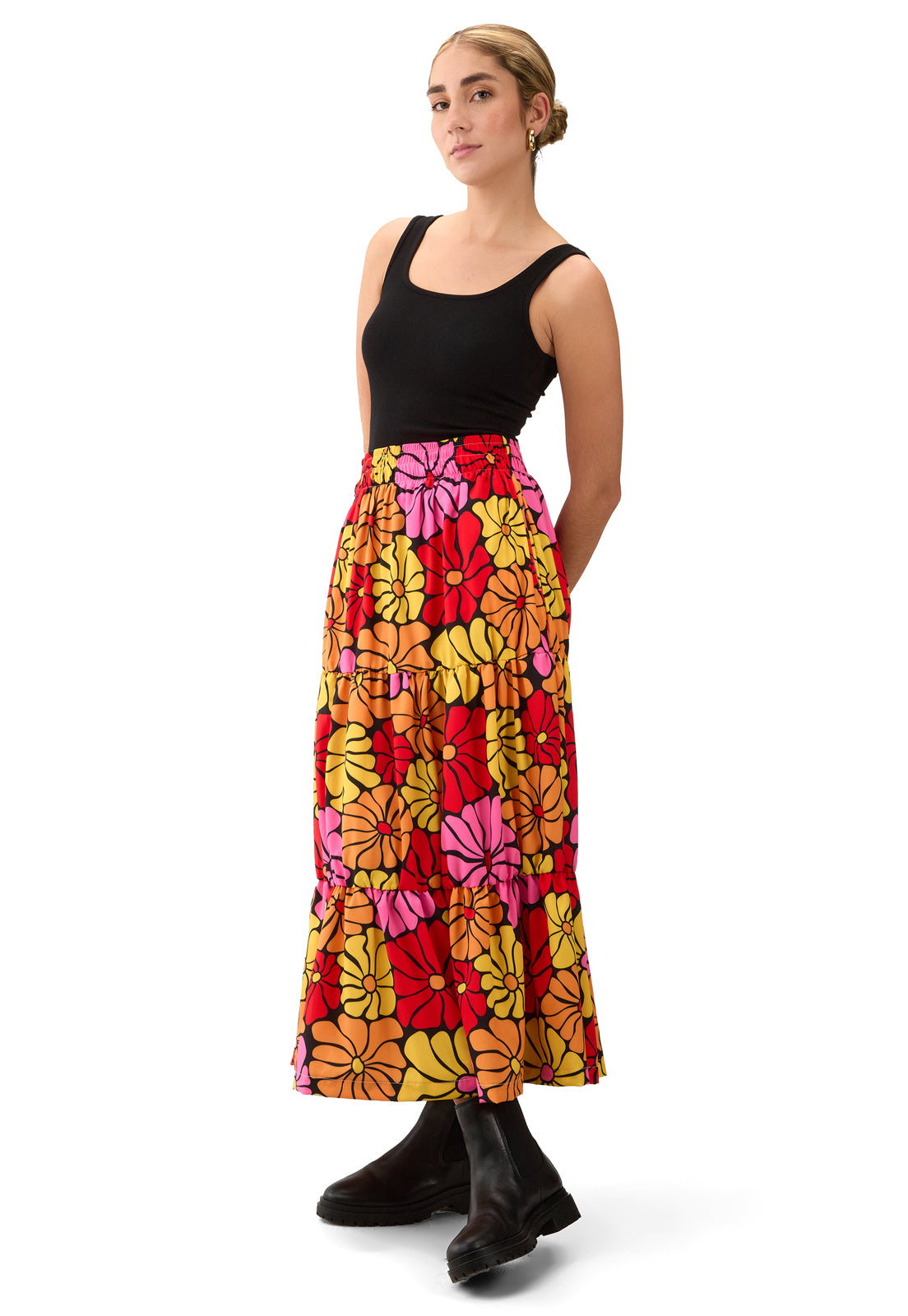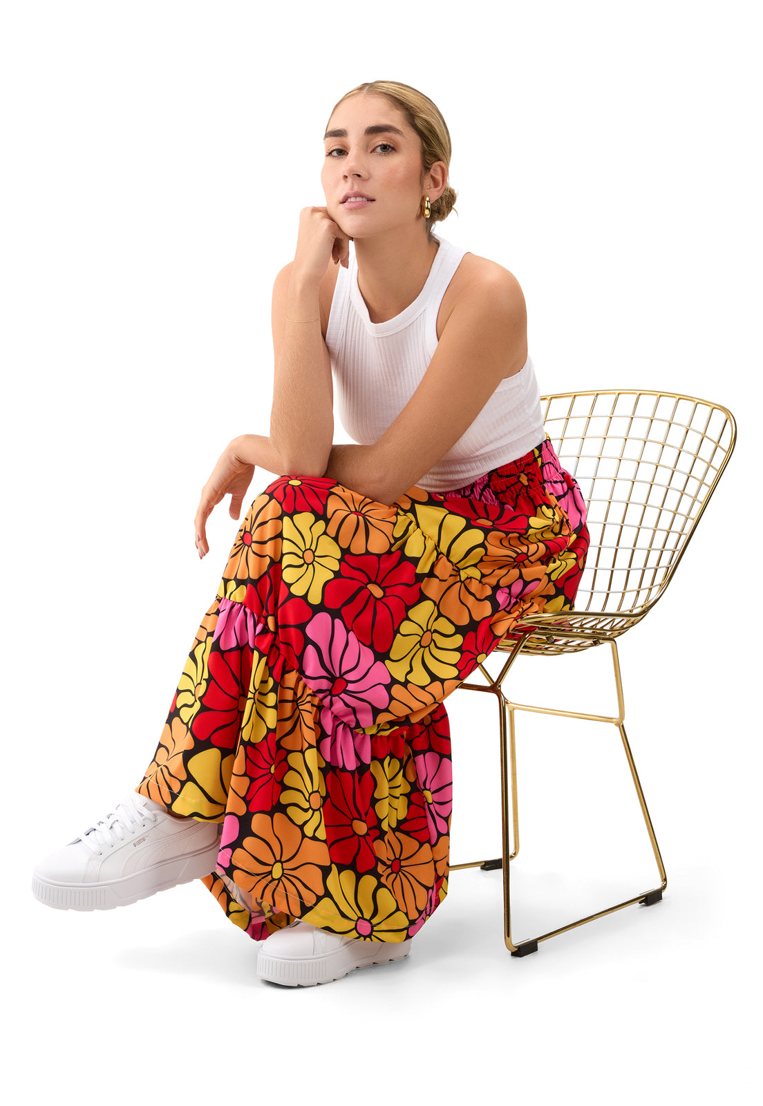 Está diseñada en seda mango, una tela suave, fresca y con mucho movimiento; su estampado es 100% exclusivo de nuestra marca. Su silueta es amplia y cómoda, tiene bolsillos, su cintura viene enresortada.