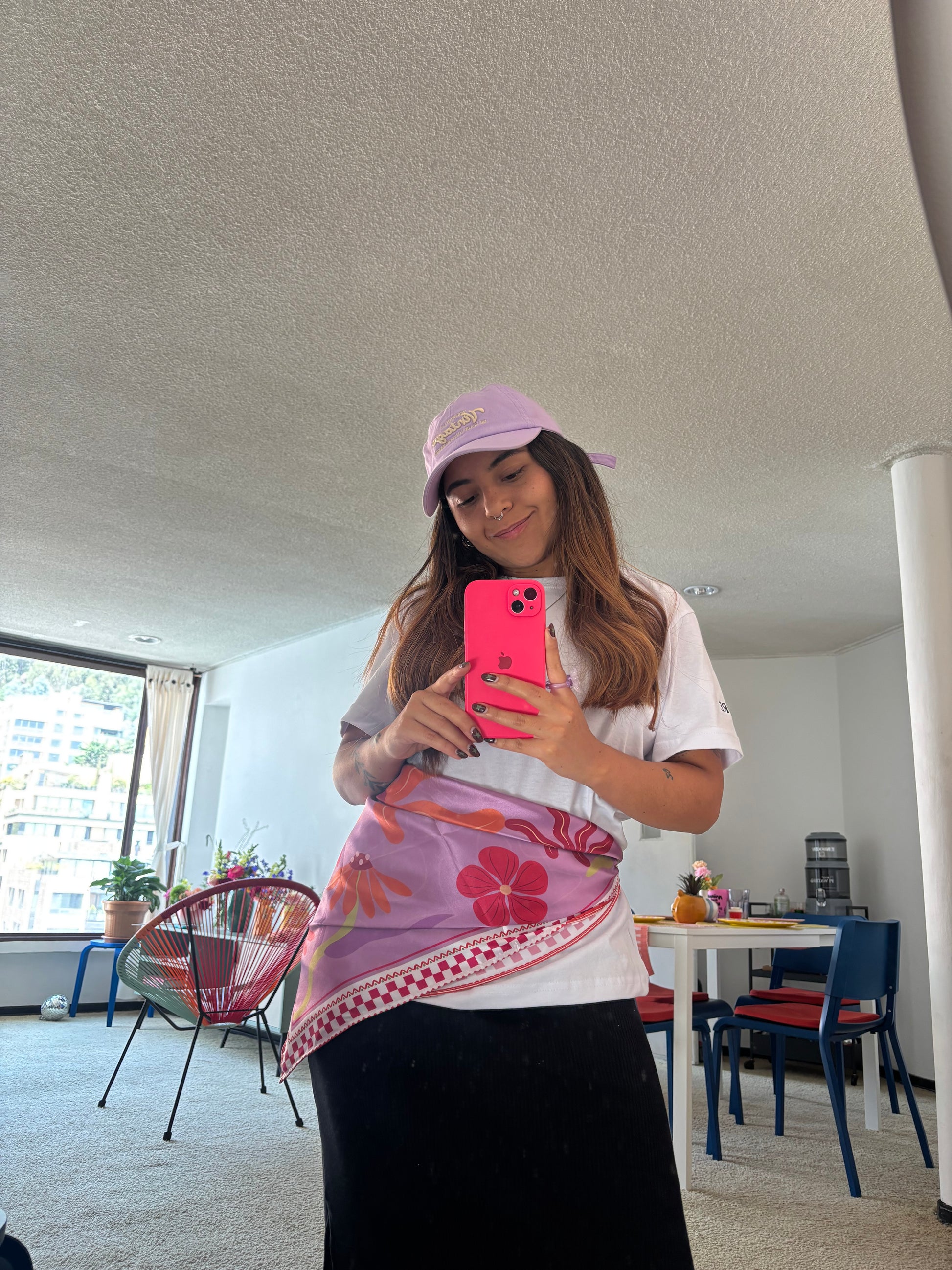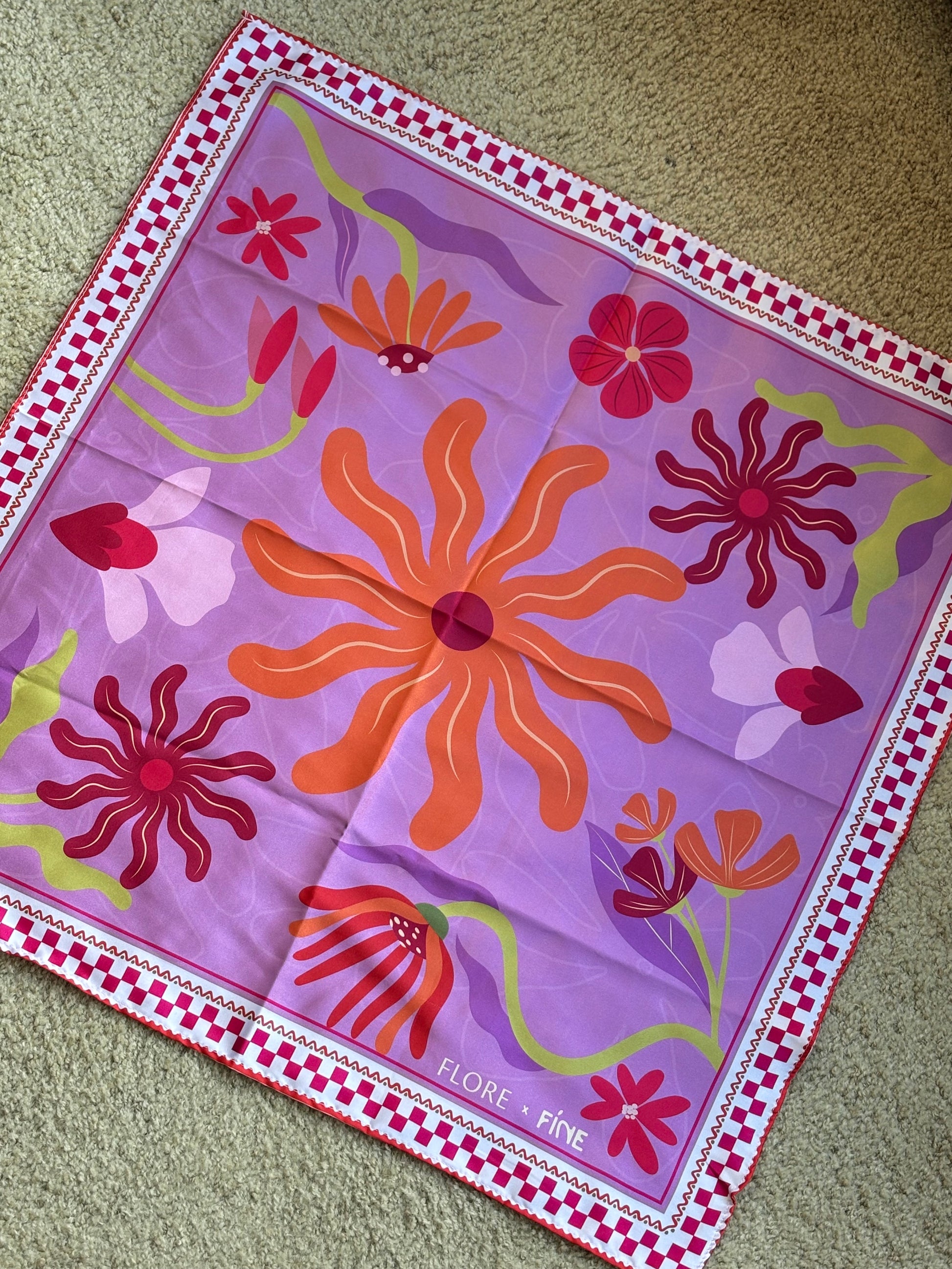 Nuestra pañoleta Flores de verano está diseñada en satín licrado; puedes usarla de mil maneras, su tamaño es de 75x75 cm.